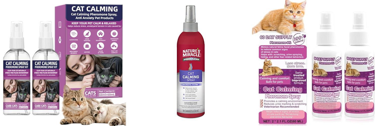 - This spray uses natural feline facial pheromones, which vets recommend. It helps calm anxious cats and reduces stress-related behaviors like scratching and marking.