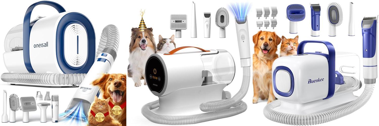 • Comes with a 7-in-1 kit including a grooming brush, deshedding tool, clippers, paw trimmer, nail grinder, nozzle, and cleaning brush.