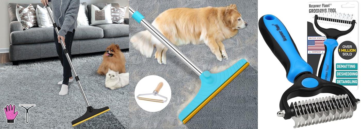 • You get a set of three tools: the long-handled rake, a Y-shaped silicone fur remover, and a grooming glove.