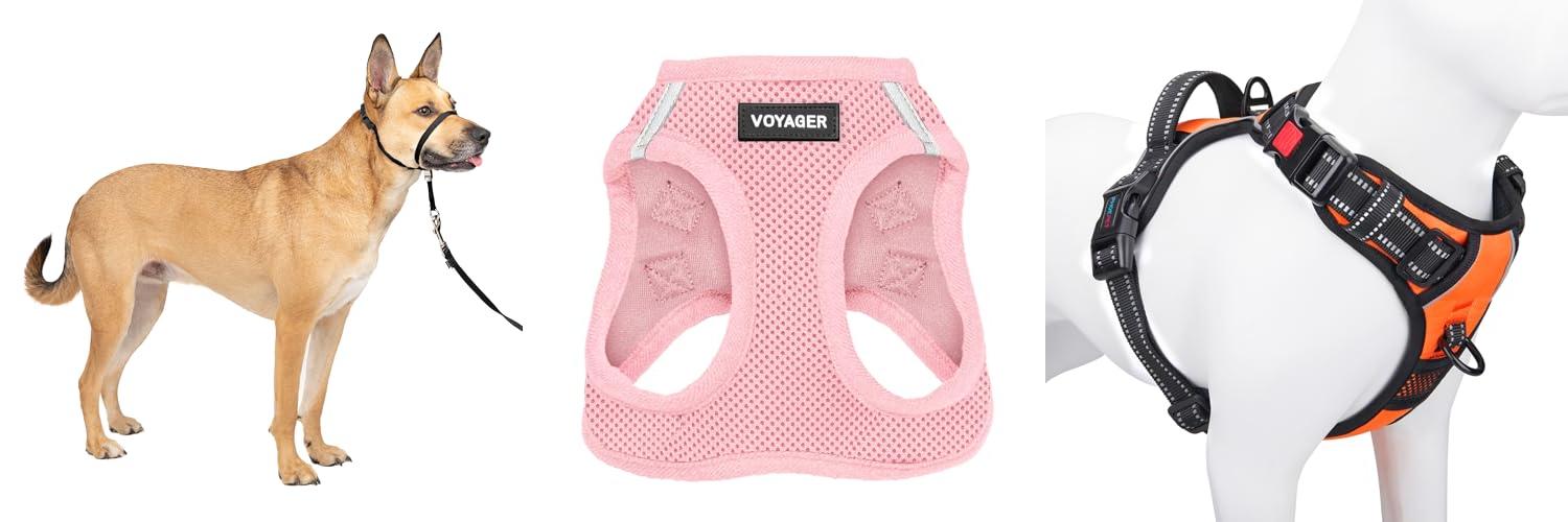 A: A halter guides the head, while a harness typically attaches to the dog’s chest or back to distribute pressure.