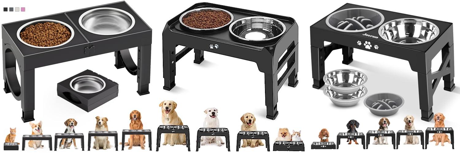 The Jovrun Elevated Dog Bowls are a fantastic feeding solution for your furry friend. This set includes two sturdy stainless steel bowls and a bonus slow feeder bowl, all designed to promote a healthier dining experience. The adjustable stand makes it perfect for dogs of all sizes as they grow.