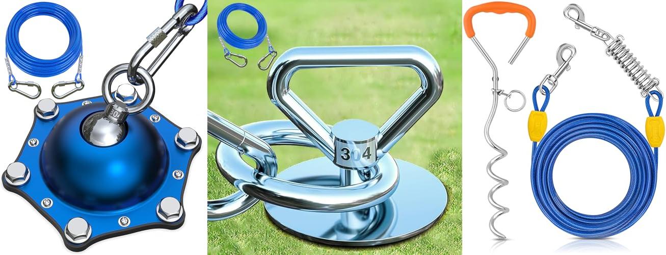 - VERSATILE USE: Beyond dog tie-outs, it works as a heavy-duty ground anchor for many outdoor items like swing sets, trampolines, tents, and RV awnings.