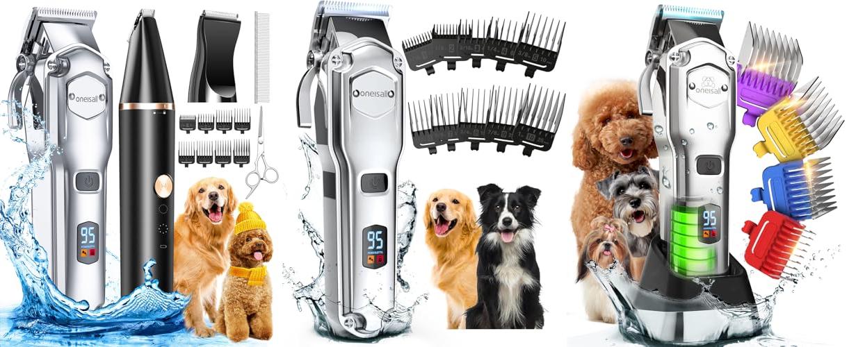 1. oneisall Dog Grooming Kit for Heavy Thick Hair&Coats/Low Noise Rechargeable Cordless Waterproof Dog Clippers for Grooming Animals&Pets/Pet Shaver with Stainless Steel Blade and Paw Trimmer