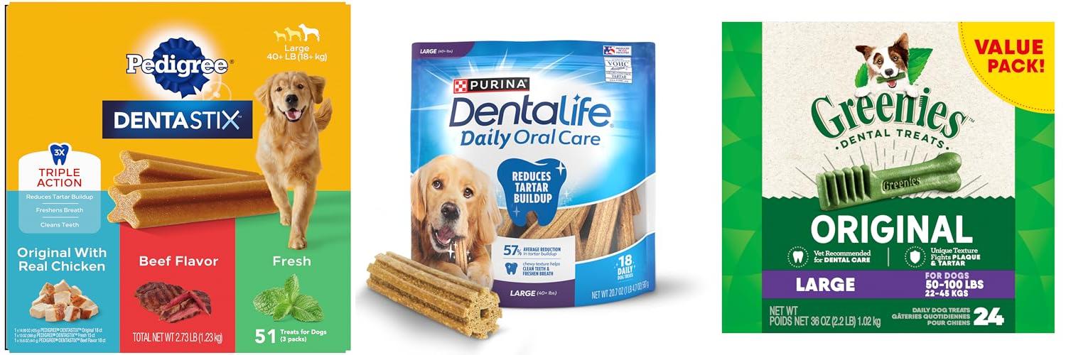 • These treats offer “Triple Action” benefits: they help reduce tartar buildup, clean your dog’s teeth, and freshen their breath, all in one chew.