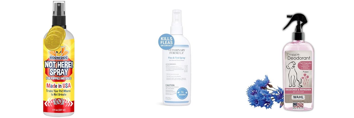 A: Most sprays are for household use only, not for applying directly to your dog. Always read the product instructions carefully. There are special pet shampoos and wipes for that.